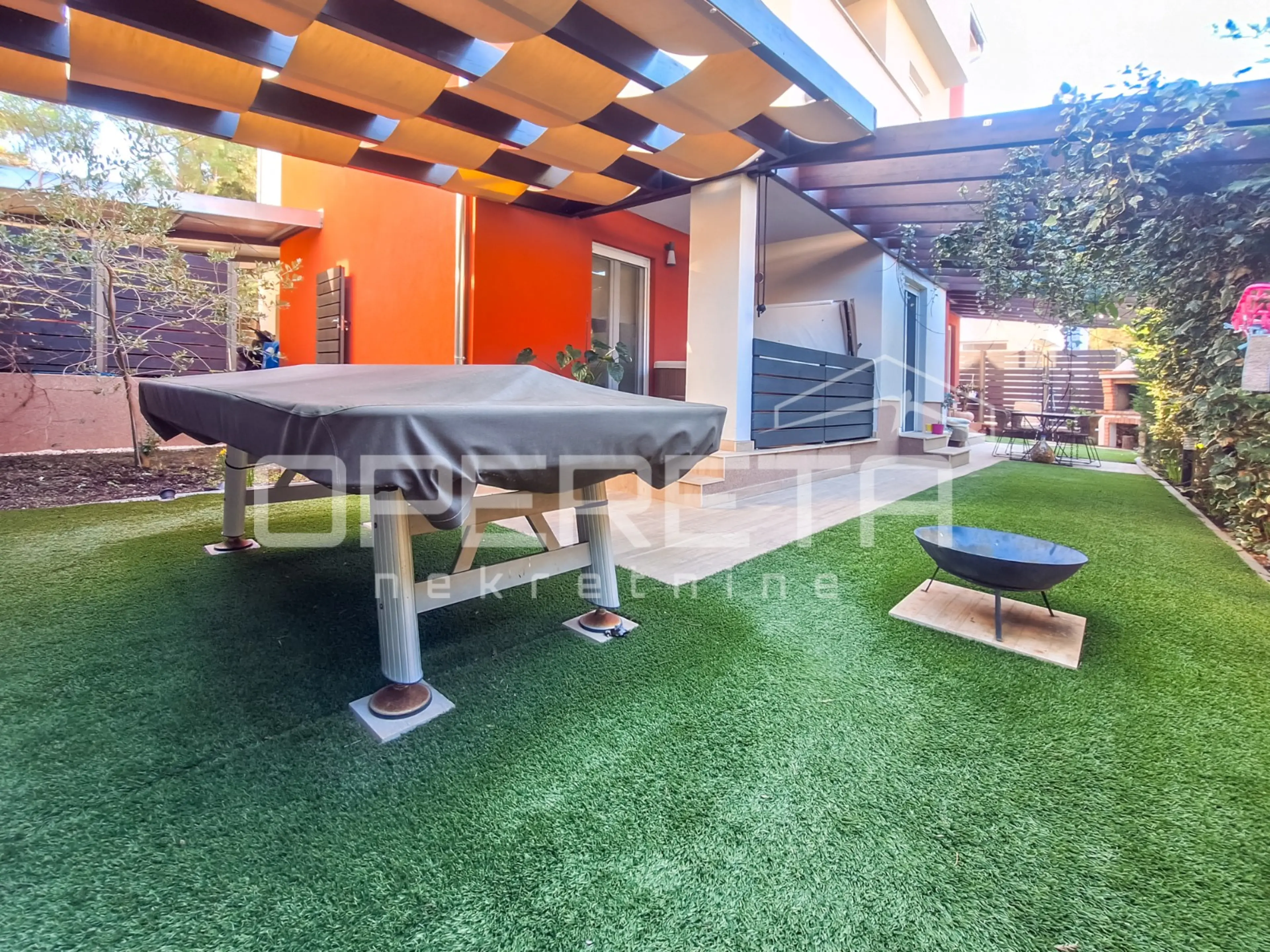 Ono što ovu nekretninu izdvaja jest prostrano vanjsko dvorište od 134 m², pomno uređeno i ograđeno, idealno za uživanje u toplijim danima. Opremljeno je roštiljem, pergolom s električnim zatvaranjem i ugrađenim senzorima, natkrivenom terasom te jacuzzijem – savršenim za opuštanje u privatnosti vlastitog doma.