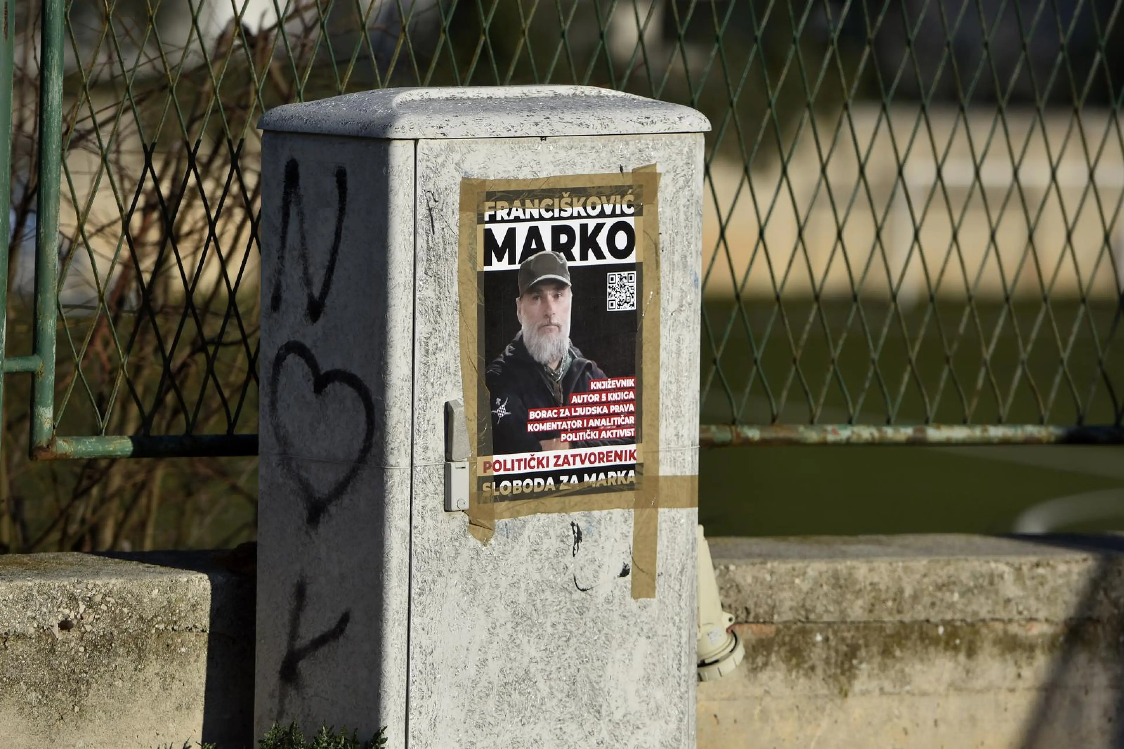'Politički zatvorenik, sloboda za Marka', piše na plakatima koji Franciškovića opisuju kao književnika, autora pet knjiga, borca za ljudska prava, komentatora i analitičara te političkog aktivista.