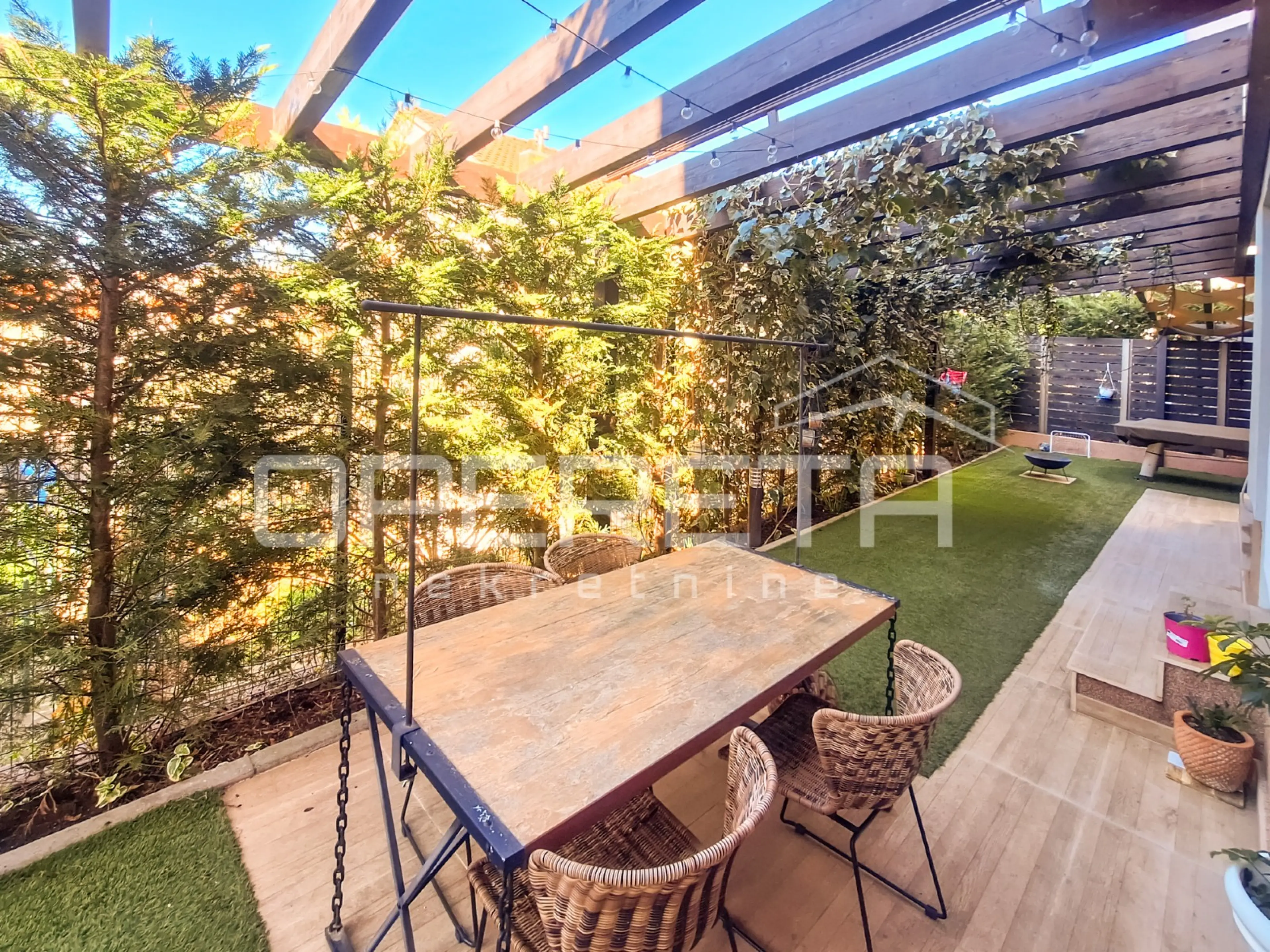 Ono što ovu nekretninu izdvaja jest prostrano vanjsko dvorište od 134 m², pomno uređeno i ograđeno, idealno za uživanje u toplijim danima. Opremljeno je roštiljem, pergolom s električnim zatvaranjem i ugrađenim senzorima, natkrivenom terasom te jacuzzijem – savršenim za opuštanje u privatnosti vlastitog doma.
