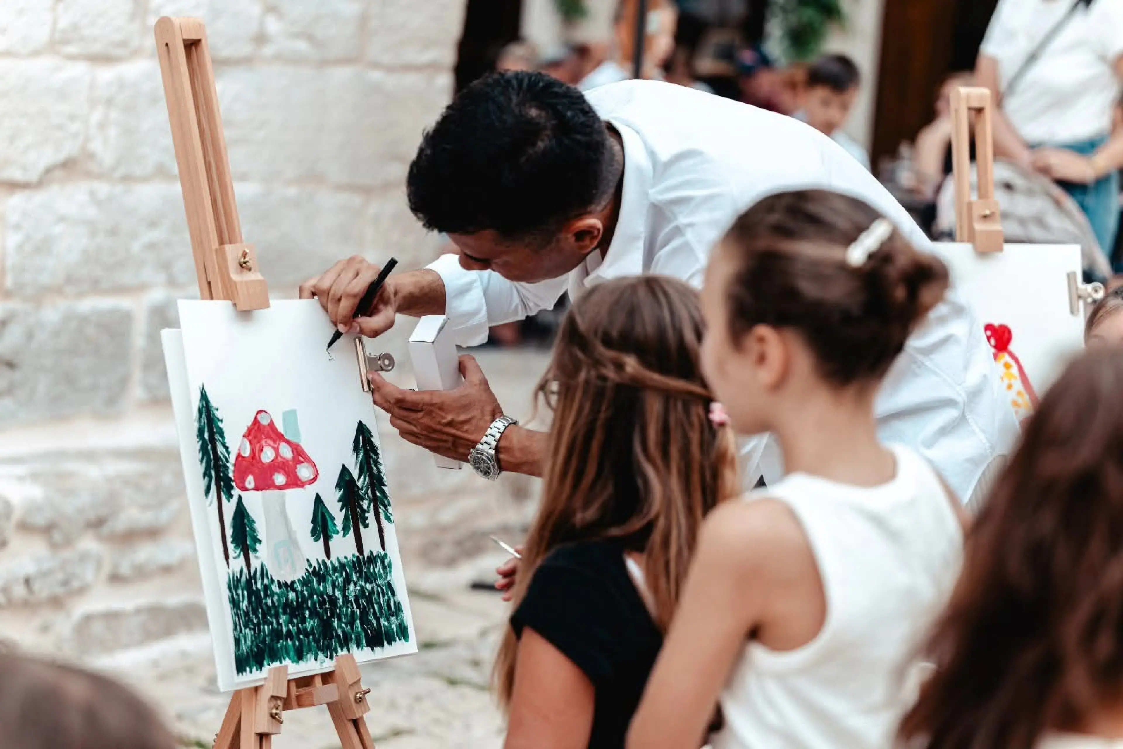 U okviru manifestacije ‘Šibenik, grad kao mi’, koja se održava u čast slavnih šibenskih glazbenih velikana Arsena Dedića, Miše Kovača i Vice Vukova, radionica je ponudila djeci priliku da puste mašti na volju. Tako su nastajale kuće na oblacima, u gljivama, na sladoledu i drveću – razigrana i šarena djela koja su pokazala koliko su dječja mašta i kreativnost bezgranične kada dobiju pravo vodstvo i poticaj.